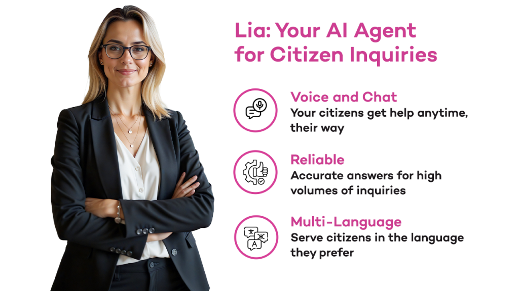 The Lia – Resilient Texan Program provides up to three months of complimentary use, including 1,000 credits, for eligible counties and municipalities. Lia is a 24/7 voice and chat agent for local governments, capable of: